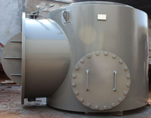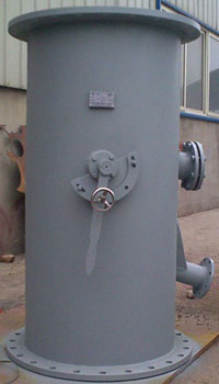 | 收球网是胶球清洗系统中的关键设备,它安装于凝汽器出水管段上,携带海绵胶球的冷却水,通过凝汽器管束,它的作用是把胶球从冷却水中分离出来,且必须具备不漏球、不卡球的性能,球被回收后由引出管从收球网引出打回装球室。我厂生产的收球网是目前最先进的结构形式,它的栅网板可以转动;在胶球装置投运时,网板处于收球位置,在不投运清洗装置时,该栅网板可以旋转到与水流方向一致的位置;既减少水阻又起到清除栅板上杂物的作用。网板的转动定位由电动执行机构执行(小型收球网为手动控制)。栅网板到位与否是保证收球网收球效率的关键之外。具体形式有SD(单网片)、 SF(A字分流式)、SLD(漏斗型)型。一、SD型收球网型号:1、 结构特点 SD型收球网由一个网板、一个操作轴、导流翼、外壳、操作机构(电动执行机构)等组成。网板由不锈钢条制成,可以转动,当网板靠在外壳壁上时为收球位置,转动一定角度到达反洗位。2、 工作原理 ① 收球位置:当系统运行时,网板处于收球位置,此时网板四周紧贴外壳内壁,胶球通过网板阻拦在一侧汇集,经引出管,被一小股水流携带吸入胶球输送泵,这样,胶球又被送回装球室进行再循环使用。 ② 反洗位置:网板前后压差达一定值时,操作网板至反洗位(收球后进行),此时积存在网板上的杂物,就会被冷却水流冲洗并携带走。3、 主要技术参数 收球率:≥95% 水 阻:≤300mmH2O 网板板条间距:7mm 电 源: 380V4、设备外形与结构尺寸 |