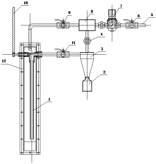 1、 取样管 2、取样瓶 3、旋风分离器 4、连接活接头 5、进汽短管 6、压缩空气控制阀 7、压缩空气调压阀 8、射器抽气器 9、吹扫阀 10、取样操作杆 11、取样阀 12、外壳体